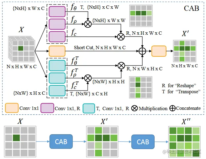 - 交叉注意力模块,用于整合 BackBone 的特征,该模块分为上下两部分,上部分构建水平方向注意力,下部分构建垂直方向注意力,整合水平方向注意力和垂直方向注意力得到全局注意力