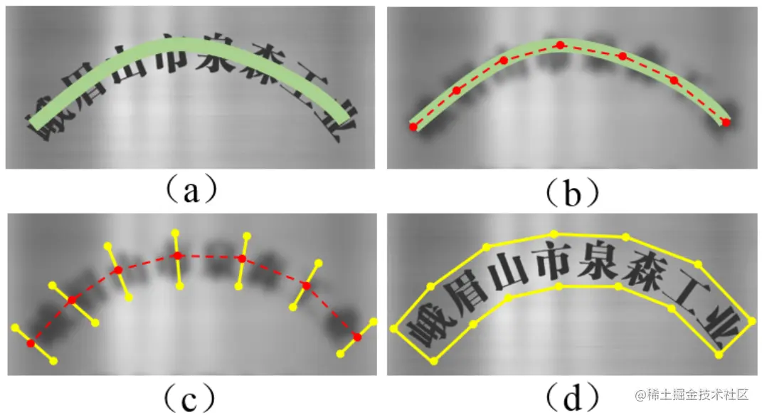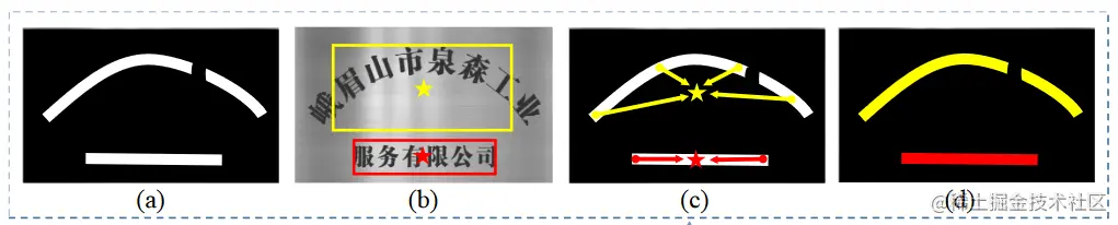 - b+c=d) 根据 TCO 合并文本实例->文本行 Mask :计算 TCL 中属于文本的像素点的所属文本实例的几何中心点,该中心点将作为低层级像素信息,当步骤 c 计算所得的几何中心点与步骤 b 所得矩形框中心点重合或相近时,该像素点将被归类给步骤 b 中矩形框对应的文本实例,通过此步骤重新合并断开的文本行