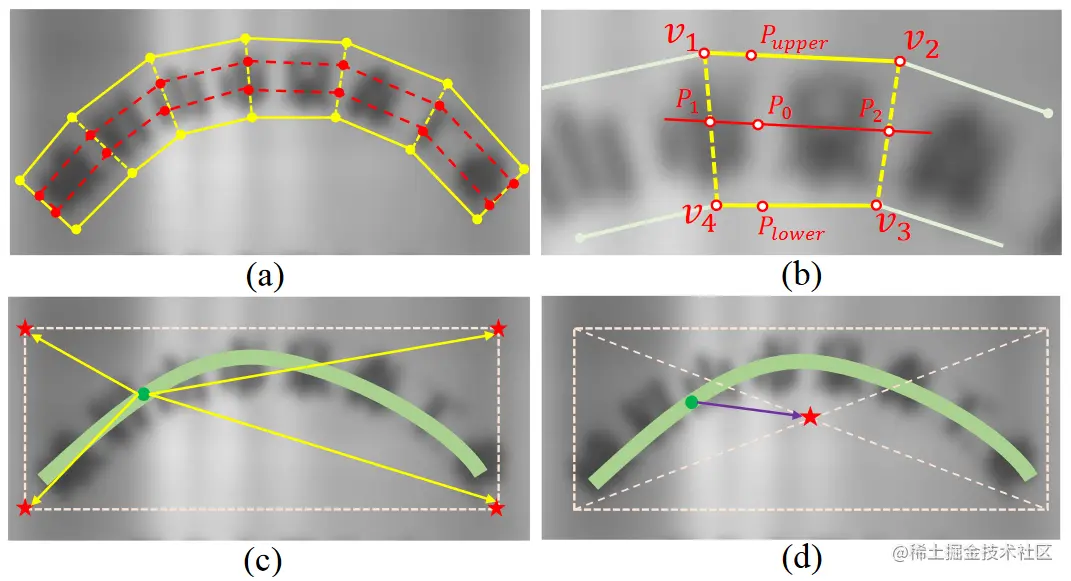 - b). TBO map (4 xHxW):文本边界偏置,首先计算斜率 k 1 (v 1, v 2)与斜率 k 1 (v 4, v 3)的平均值,对于一个给定的点 P 0,可容易地计算出斜率为 (k 1+k 2)/2、过点 P 0 的直线,由此该直线与线段 (v 1, v 4)和线段 (v 2, v 3)的交点 P 1 与 P 2 很容易得出,故 P 0 的上下边界点 和 的坐标可由线段比例关系得到,整理得到 P 0 点到四边距离的 TBO 为{、 、、}