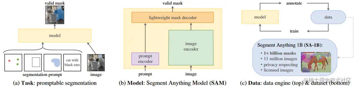 - a)SAM 利用“图片-分割提示”实现对图片上任意目标的分割,分割提示包括:点、框、Mask、文本