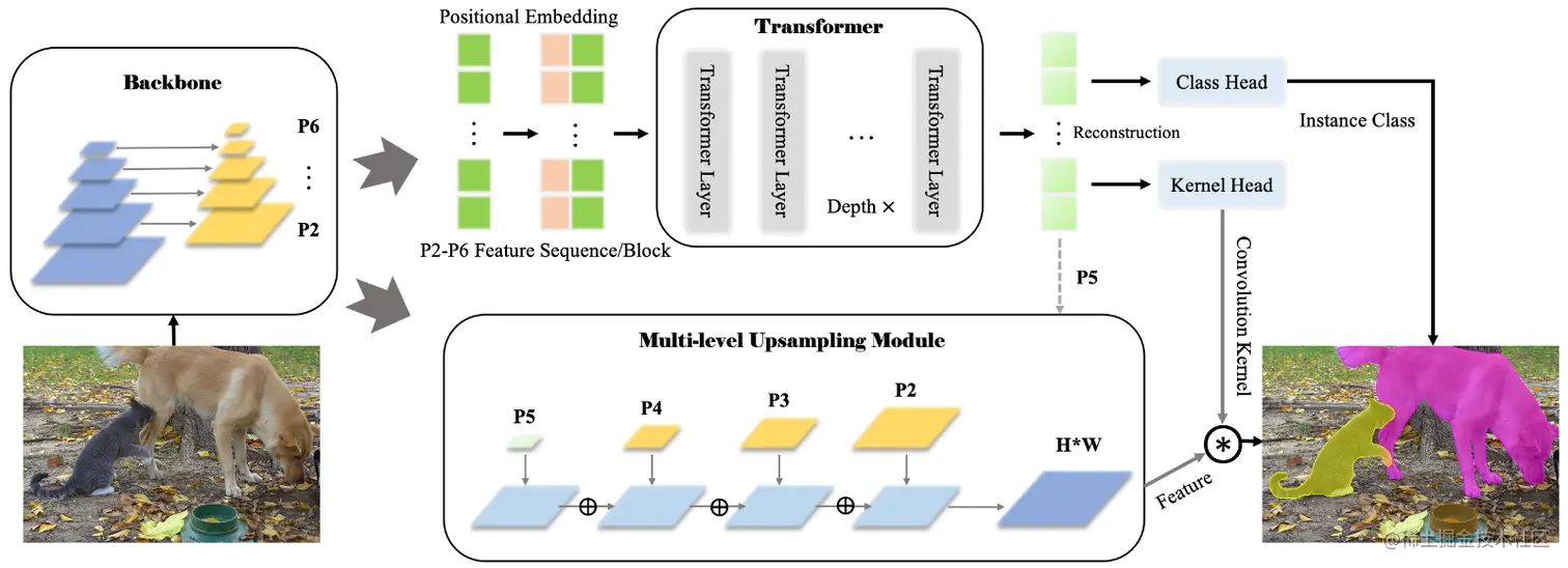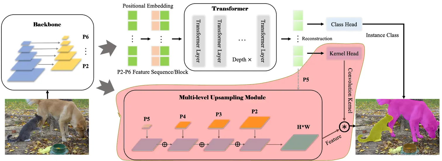 SOTR 利用 transformer 将实例分割任务简化为 2 个过程,一是通过 transformer 预测每个实例的类别,二是通过多级上采样模块动态生成分割掩码