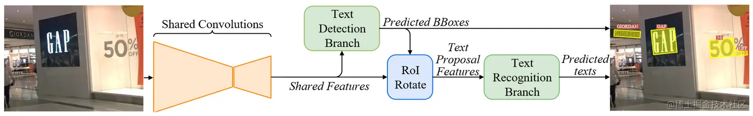 - 第一个端到端解决文本识别的模型,相比较两阶段的文本定位方法,它的检测速度更快,基本思路是通过文本检测分支实现文本行区域的提取,然后通过 RoIRotate 模块实现文本行的“摆正”,最后使用 CRNN+CTC 的模式实现文本行的字符识别