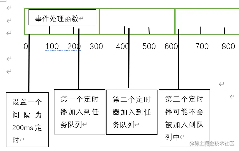 假设我们在一个事件处理函数中注册了一个 200ms 间隔的 setInterval, 但是定时器最小执行时间为 10ms, 即使设置为 0, 也会改为 10ms, 详见 W3C