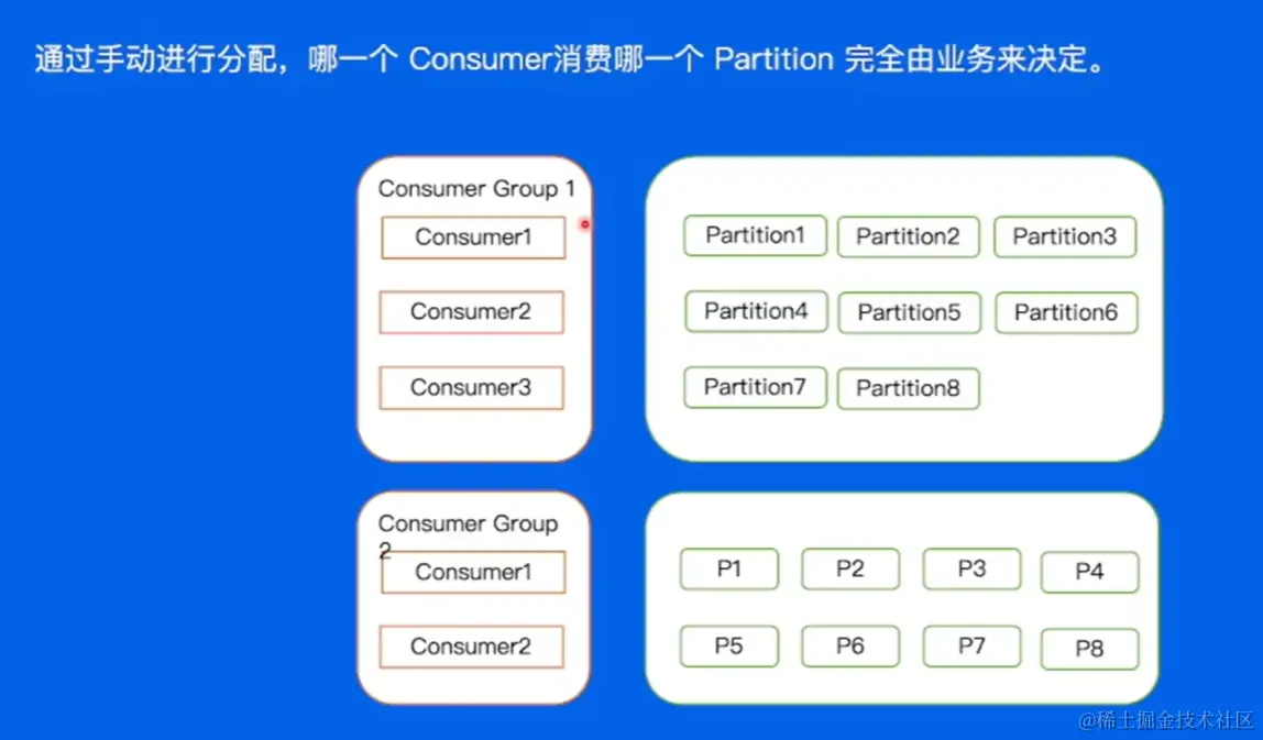 每个 Consumer 其实是一条进程,写入的时候就告诉他要拉取谁谁谁。(告诉Consumer1要拉去Partitin1, 2, 3,等。)