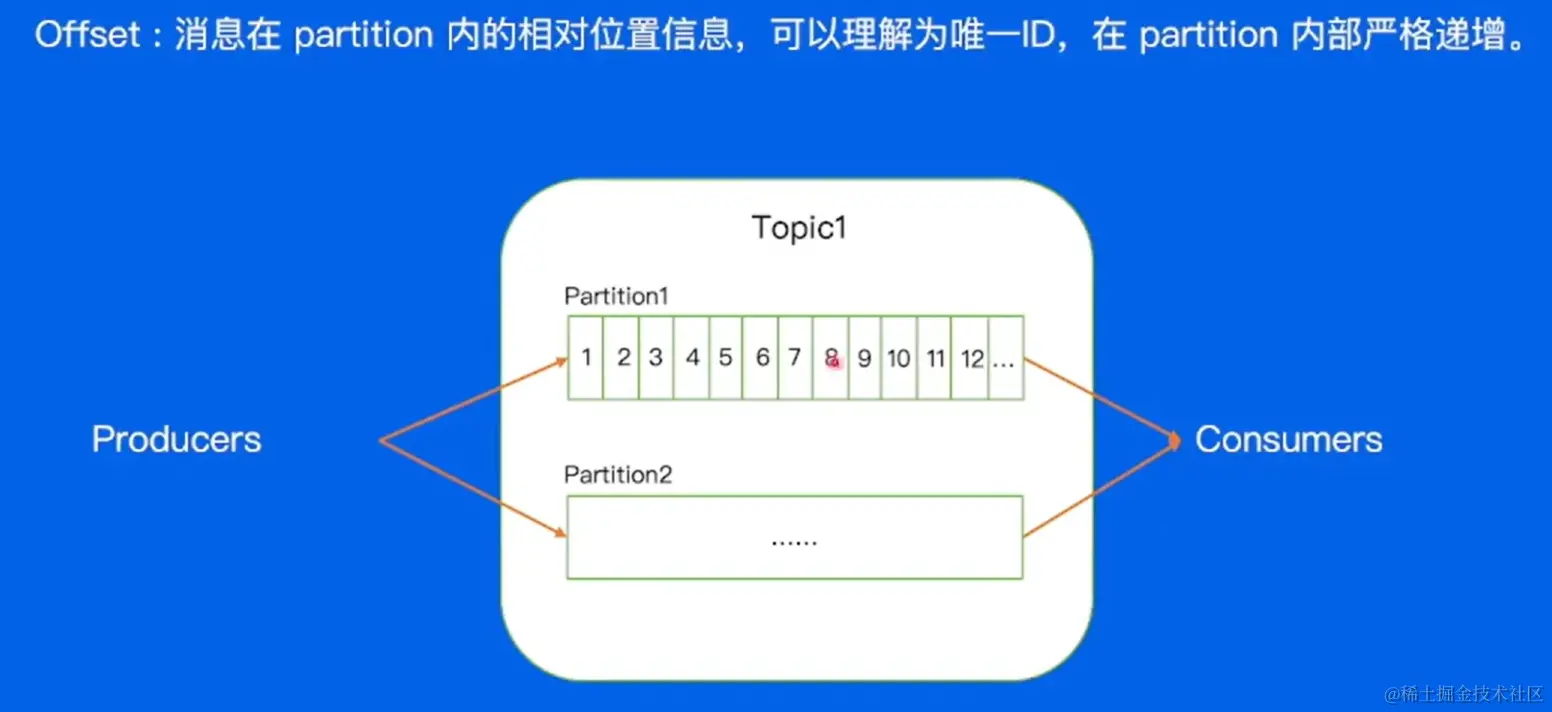 每个partition内部都会存储不同的消息,每个消息都有唯一的 Offset ,Offset在Partition是递增的。