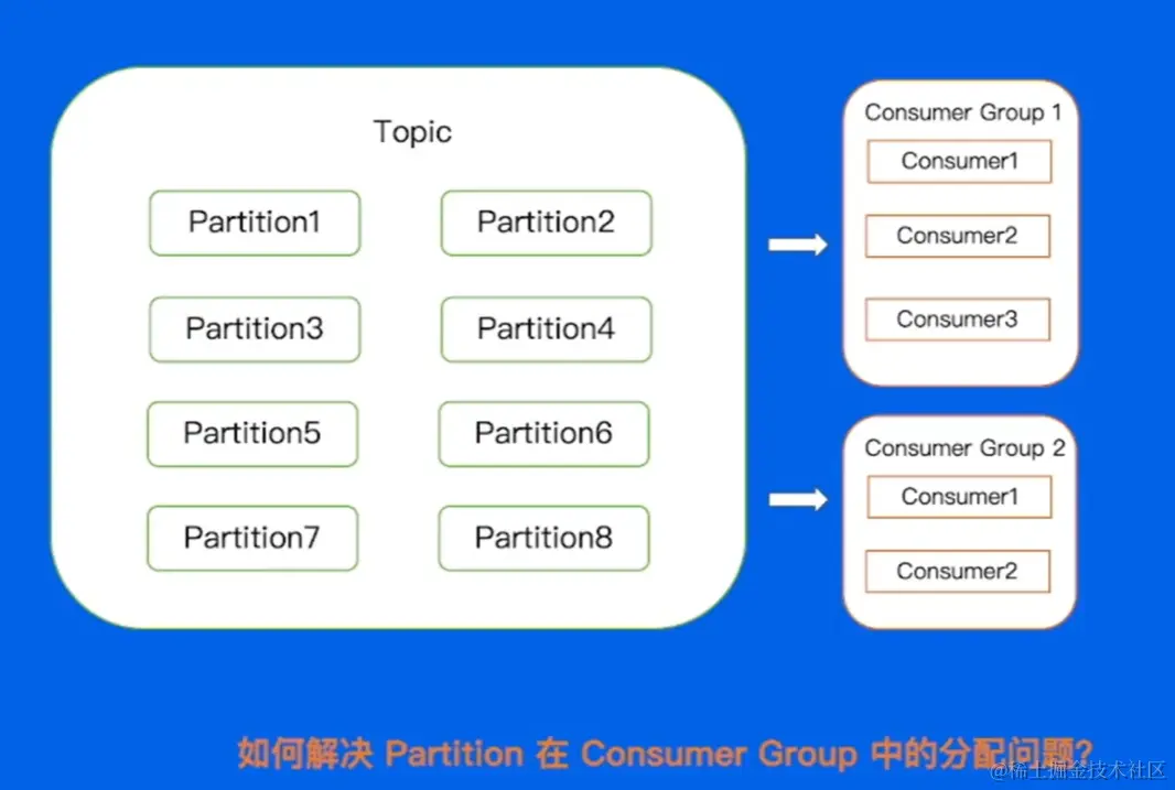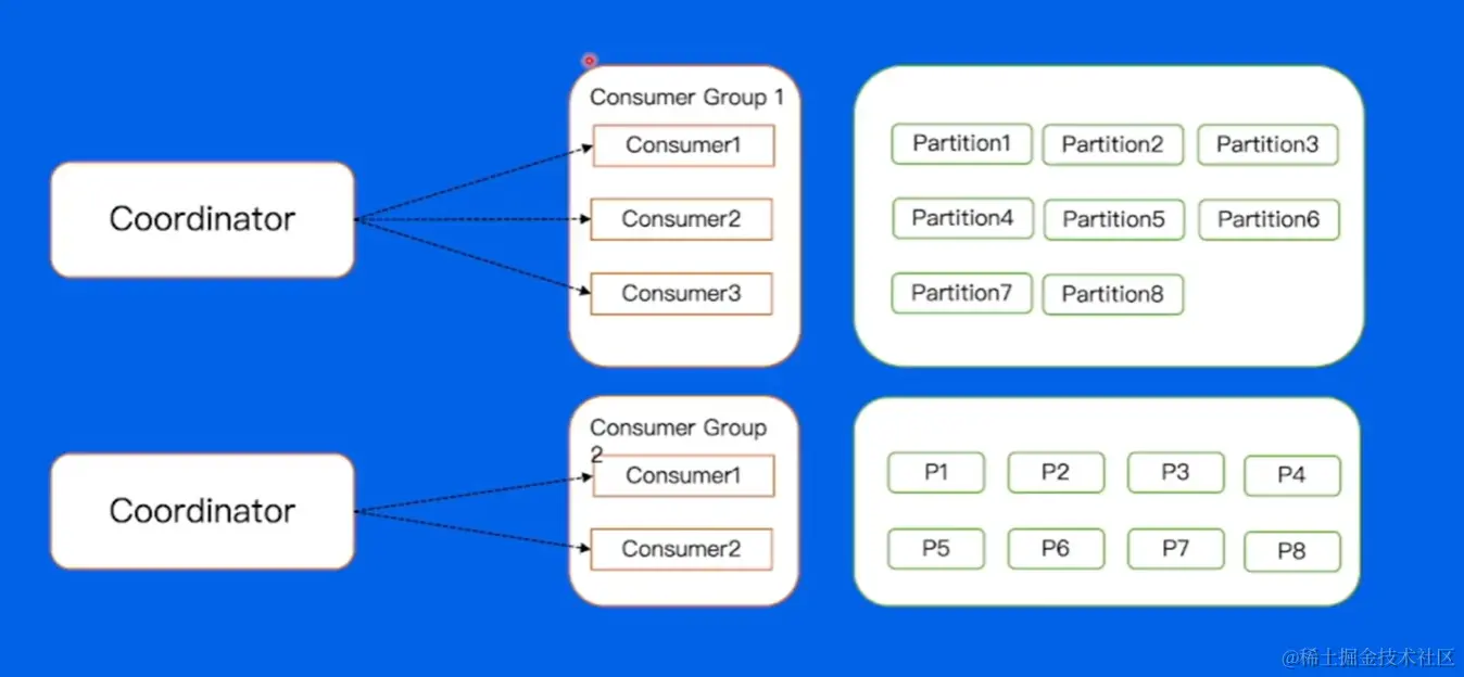 Conrdinater 去帮助每个 Gcomsumer Group 中的 Consumer 去自动分配 Partiton(Rebalance)。