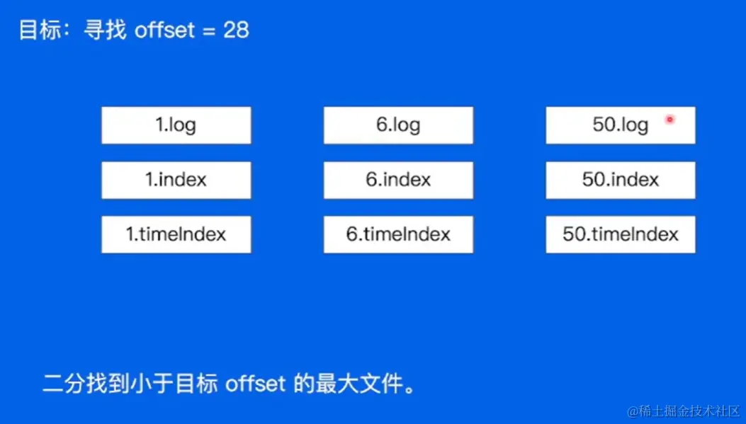 在一个 Broker 中存放着一些 partition 的一些副本,最终是以日志的形式写入磁盘,对于某一条日志,他会有序的切成多个日志段(LogSegment),每个日志段包含四个文件(.log、.index、.timeindex、其他文件)