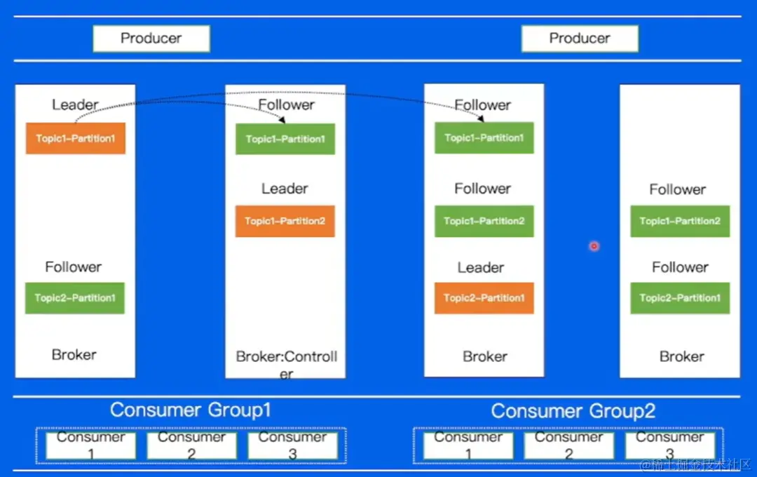 其中第二个 Broker扮演者一个 Controller 的角色,负责对集群当中的所有副本以及 Broker 进行分配。