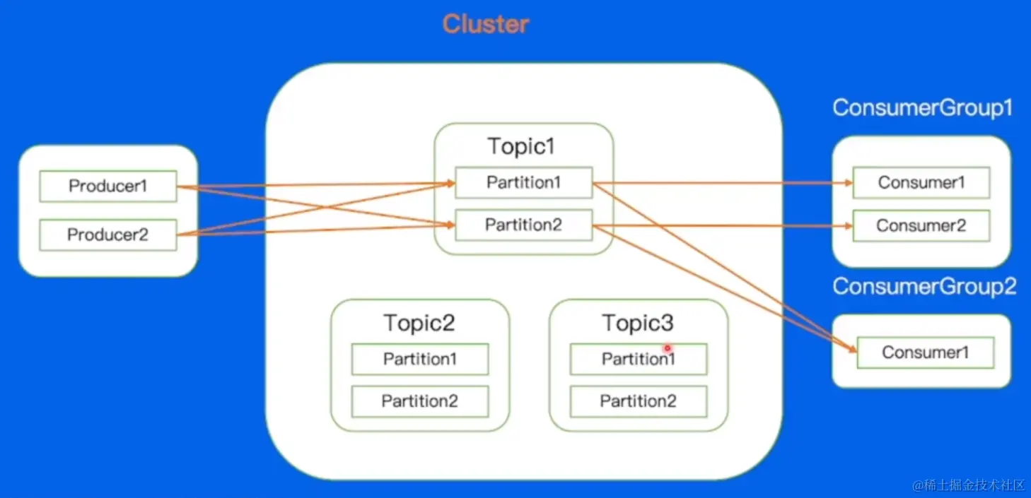 Cluster:物理集群,每个集群中可以建立多个不同的 Topic