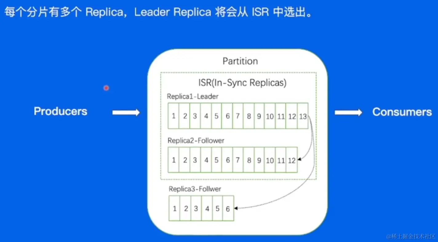 是 Kafka 为某个分区维护的一组同步集合,即每个分区都有自己的一个 ISR 集合,处于 ISR 集合中的副本,意味着 follower 副本与 leader 副本保持同步状态,当两个副本差距过大时候,就会被踢出副本。只有处于 ISR 集合中的副本才有资格被选举为 leader。一条 Kafka 消息,只有被 ISR 中的副本都接收到,才被视为“已同步”状态。现在是通过时间进行判断。