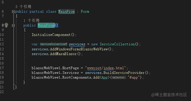 首先流程是先创建一个ServiceCollection,用于注册服务,在和BlazorWebView进行绑定!将指定的html和BlazorWebView绑定以后在对于html内的id为app的元素进行Blazor组件的绑定绑定到Blazor组件的App组件中;