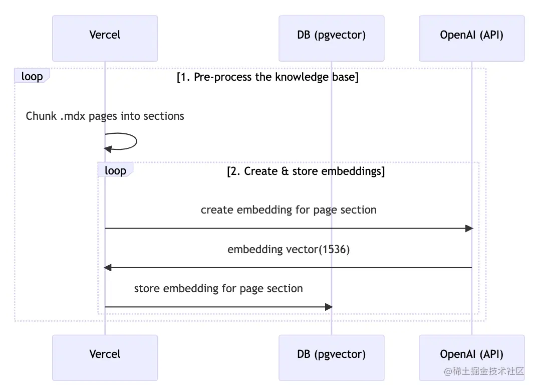 步骤 1 和 2 在构建时发生,例如当 Vercel 构建您的 Next.js 应用程序时。在此期间,将执行 generate-embeddings 脚本,该脚本执行以下任务: