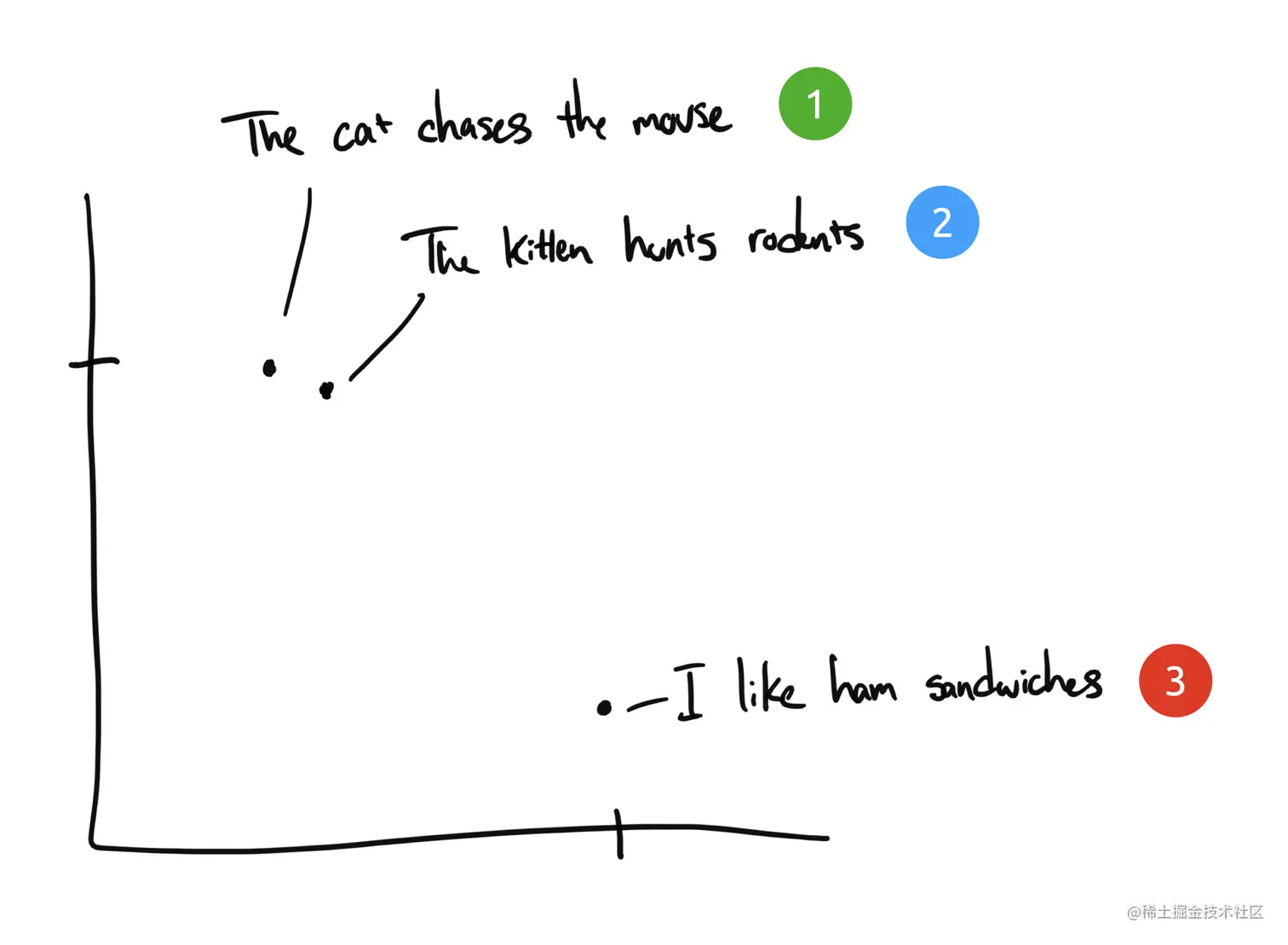 短语 1 和 2 将被绘制的位置比较接近,因为它们的含义相似。而短语 3 所在的位置与其他短语的距离较远,因为它与其它短语没有关联。如果我们有第四个短语 “Sally ate Swiss cheese”(莎莉吃了瑞士奶酪),它可能会位于于短语 3(奶酪可以放在三明治上)和短语 1(老鼠喜欢瑞士奶酪)之间的某个位置。