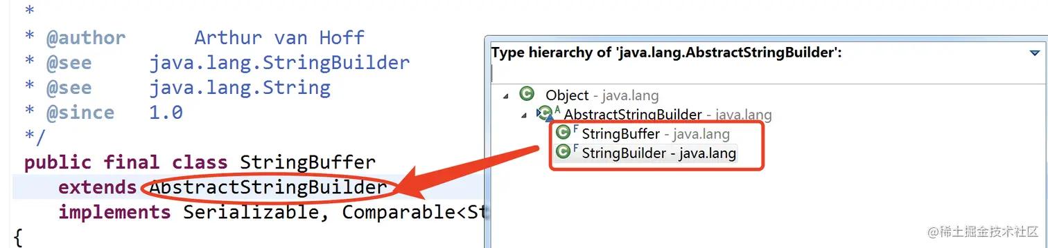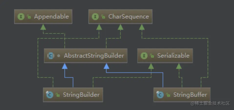 从上图可以看出,StringBuffer和StringBuilder其实都是继承自AbstractStringBuilder,所以StringBuffer与StringBuilder这两者可以说是“亲兄弟”的关系,它们俩有一个共同的抽象父类AbstractStringBuilder,如下所示: