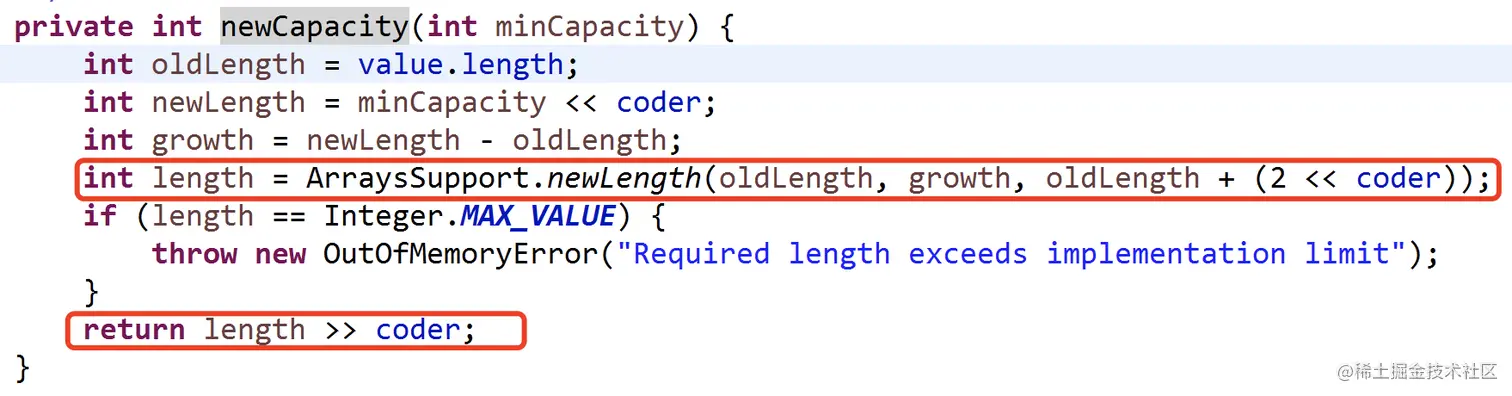 该方法的大致作用就是,获取value数组的原有长度和待追加的新字符串长度,利用ArraysSupport.newLength()方法计算出扩容后新数组的长度length,并最终返回该length。如果length的值等于Integer的最大值,说明我们传递过来的字符串太长了,就会直接触发一个内存溢出的异常。