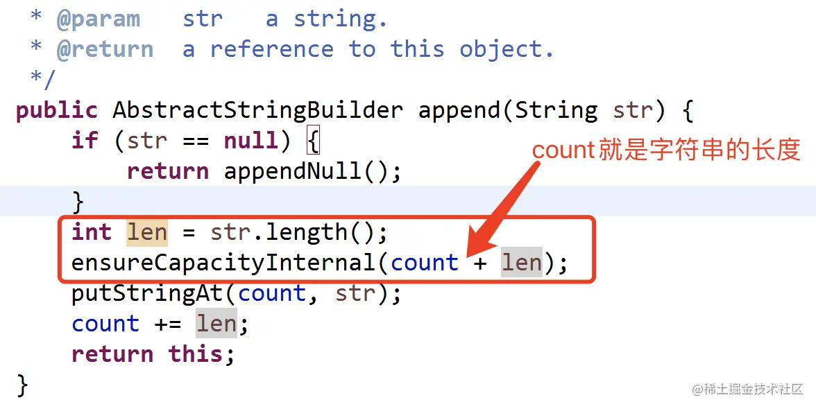 此时我们看到了一个ensureCapacityInternal()方法,从字面意思来理解,该方法是用于确保内部容量。传递给该方法的个参数是count+len,也就是 原有字符串的长度+新追加的字符串长度,即append后字符串的总长度。