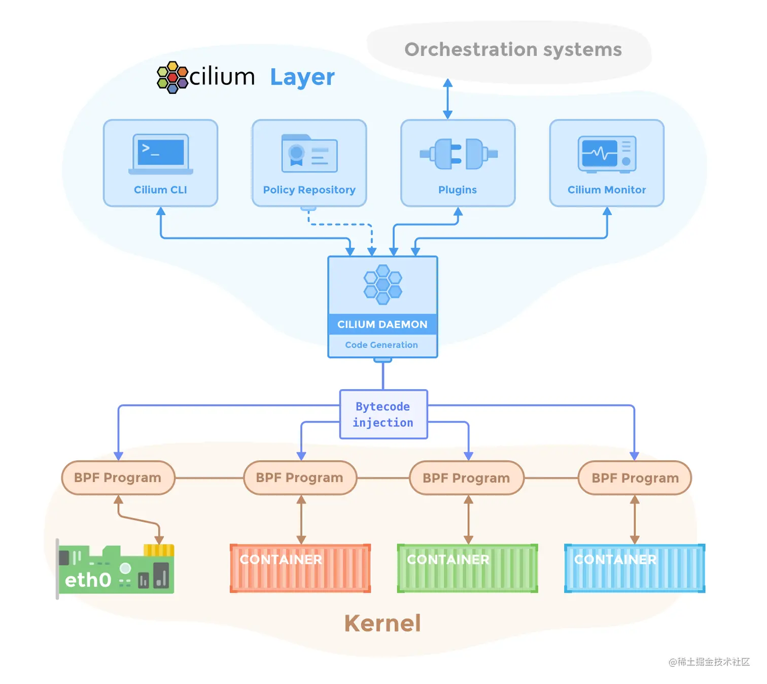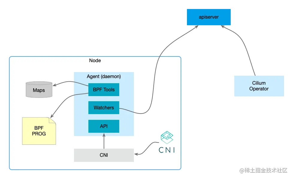 Agent 监控如 Kubernetes 等编排系统中容器或者负载的生命周期变化,管理着用来控制进出容器的网络访问的 eBPF 程序;对外(CNI Plugin、CLI)提供 API 来操作配置、Endpoint、Node、Policy、Service、IP 地址等资源。