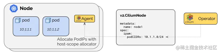 Agent 启动后,从 v2.CiliumNode 上获取 podCIDRs,而后在 CNI 插件调用时为 pod 分配 IP 地址。