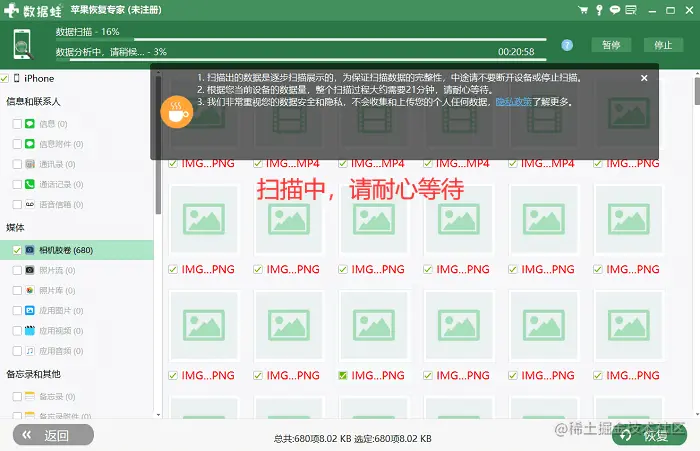 第4步:软件将自动扫描您的苹果手机,列出可恢复的数据类型。