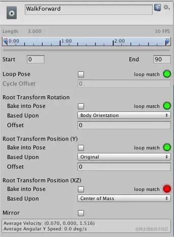 Bake Into Pose:运动的 Y 分量将保留在身体变换(姿势)上。根变换的 Y 分量将是常量,增量根位置 Y 将为 0。这意味着此剪辑不会更改游戏对象高度。您再次看到绿色指示灯,表示剪辑是将 Y 运动烘焙到姿势中的合理候选项。