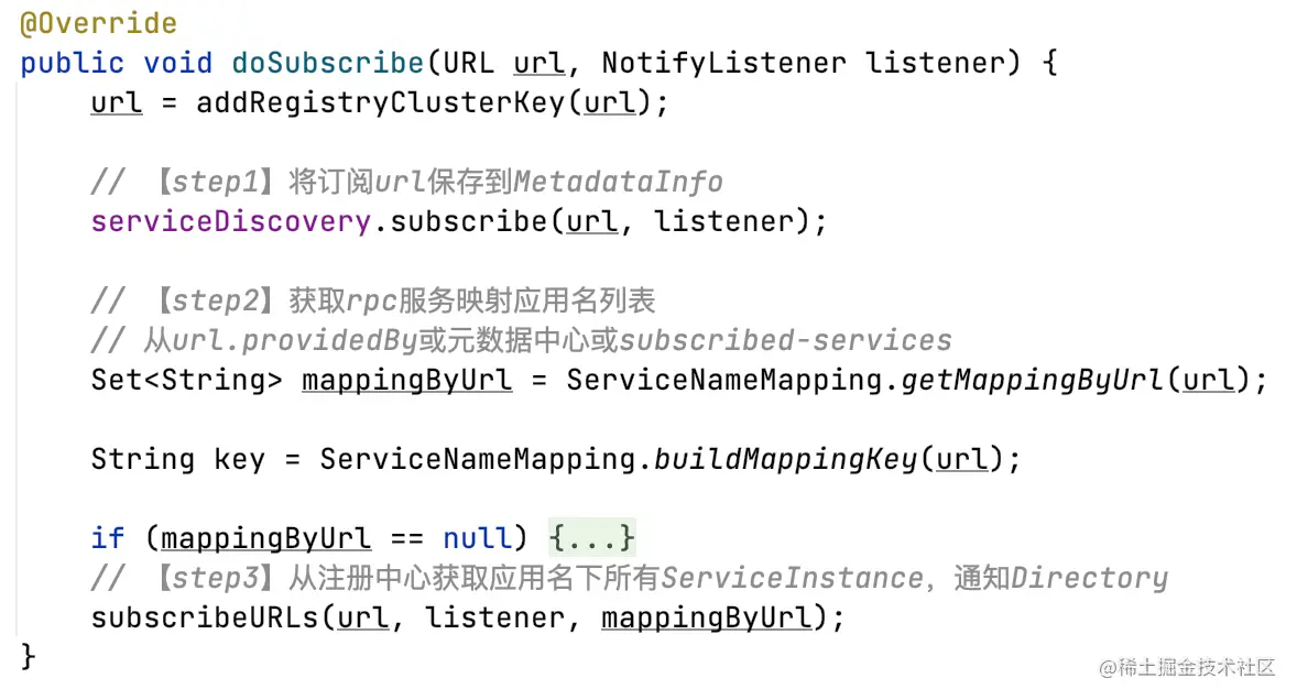 在订阅流程中,重点有三点(ServiceDiscoveryRegistry#subscribe):