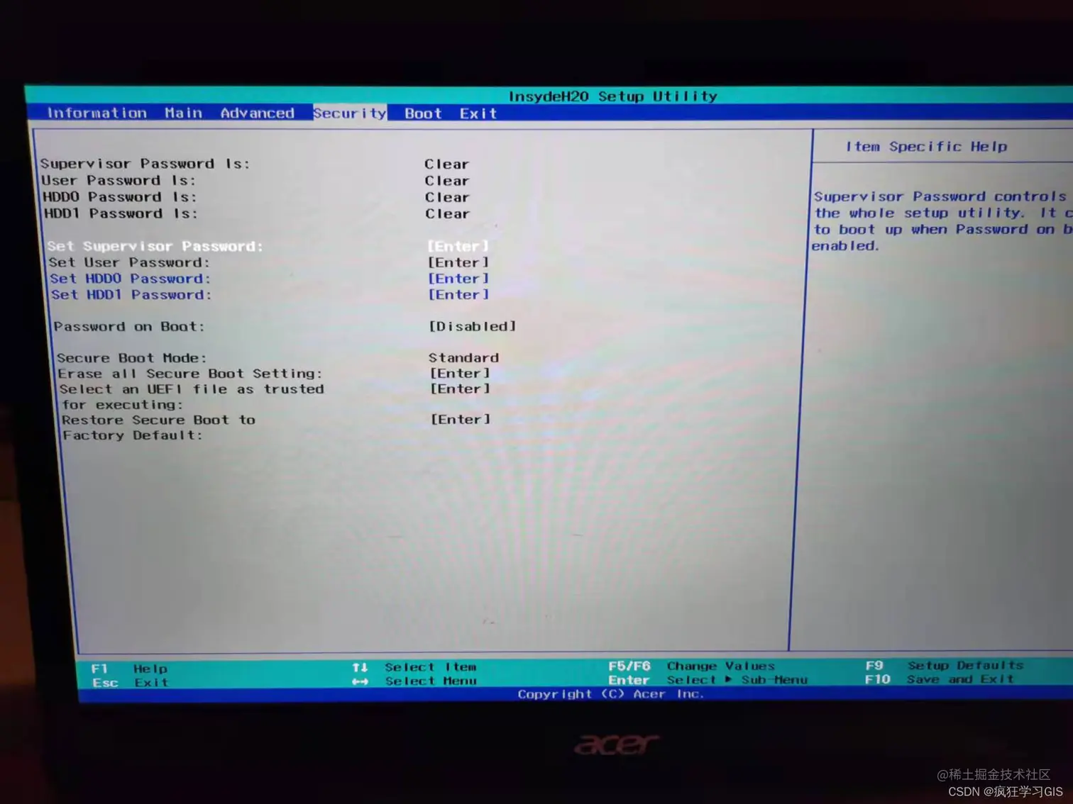 进入BIOS模式后,一般是要找到“Security”或者类似的界面并进入;随后,找到“Set Supervisor Password”这一选项。这里需要注意,由于大家的电脑品牌、型号等都不相同,因此具体的选项名称可能都不一样,但是肯定选项名称的含义都是差不多的;大家依据实际情况来找即可。