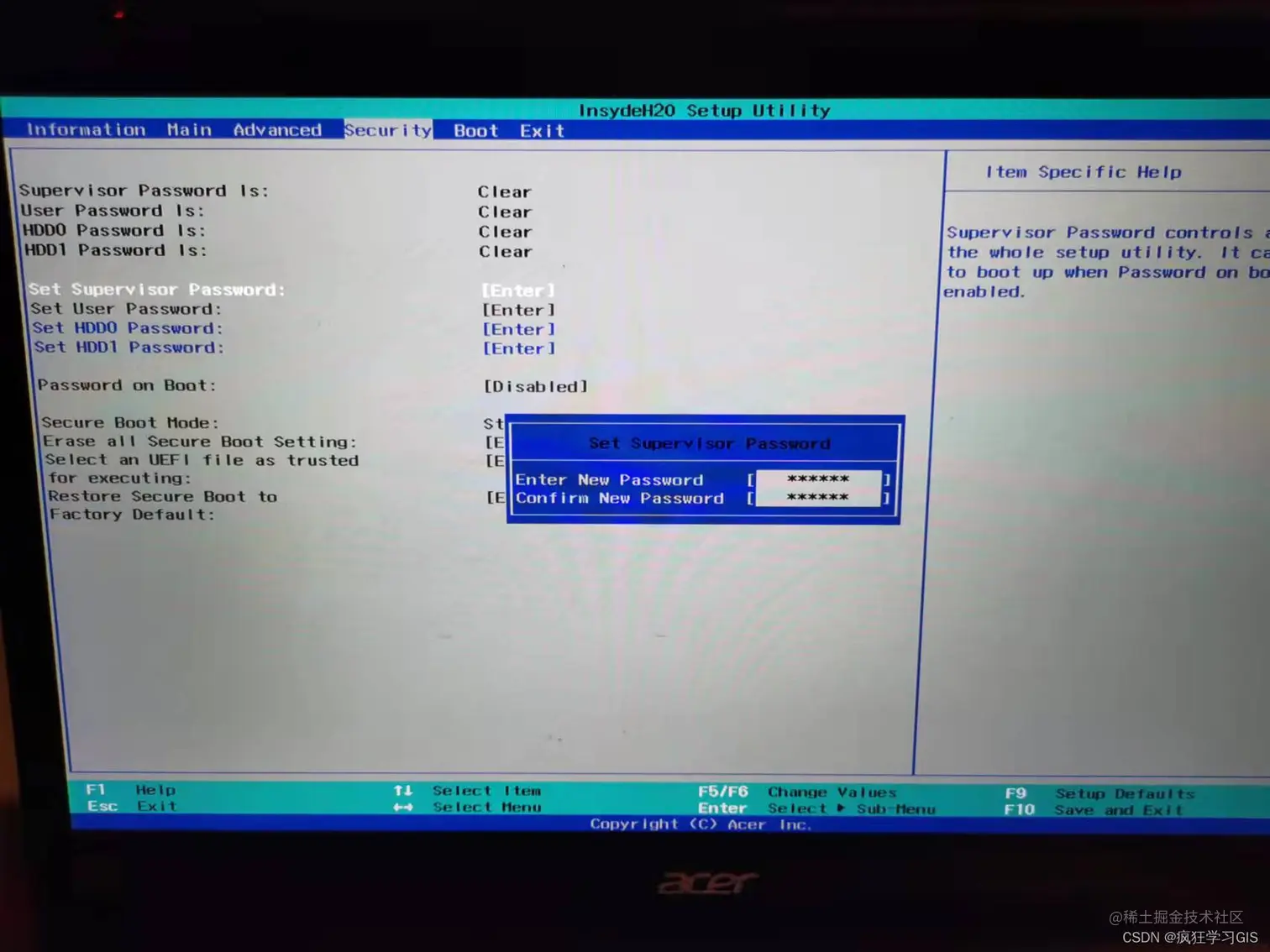 随后,进入“Set Supervisor Password”这一选项,设定密码。如果是第一次设定密码,就直接输入你想设定的密码,然后再次输入一次进行验证即可;如果大家是原本已有BIOS密码,而希望修改一下的话,就先输入原密码,随后输入两次新密码即可。