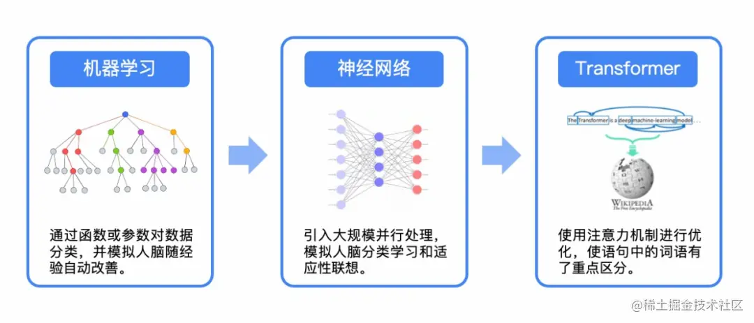 Transformer 的核心思想是使用自注意力机制(Self-Attention Mechanism)来建立序列之间的依赖关系。就在2年前,很多模型主要还是基于长短期记忆(LSTM)和递归神经网络(RNN)的其他变体,而如今大语言模型都是基于 Transformer 的注意力机制。AI领域从传统机器学习,到神经网络,再到如今的 Transformer,正以井喷的势头快速发展。人工智能发展方向