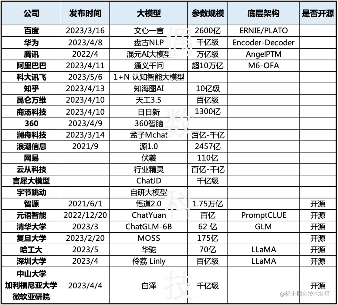 当然,大语言模型这把火也点燃了国内科技公司对大语言模型的热情,凭借前期自研或者开源模型的基础,目前国内很多机构都推出了大语言模型,不完全统计已超20家。