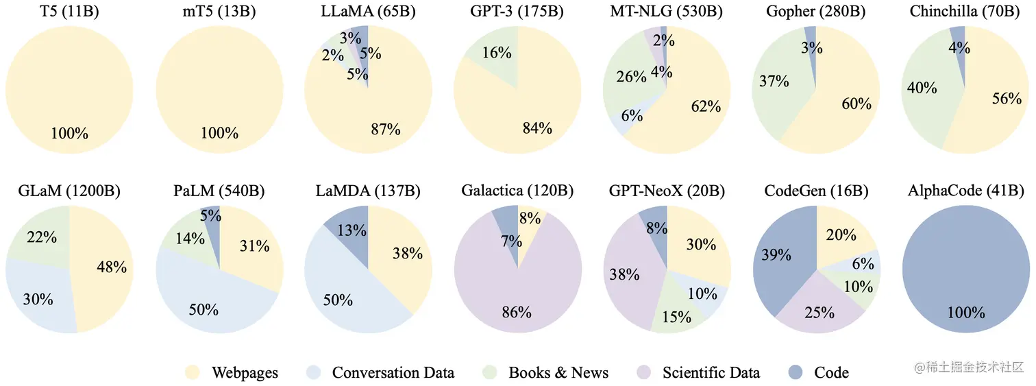 通过大语言模型的训练数据源,我们可以发现这些模型主要还是通过抓取网页数据进行训练,GPT-3 在网页的基础上还加入了部分图书信息。有趣的是 DeepMind 开发的 AlphaCode 训练数据源全部是代码,可推测其在编程方面具备强大的能力。据了解,AlphaCode 在 2022 年参加了 Codeforces 举行的 10 场编程比赛,排名前 54.3%,击败了 46% 的参赛者,Elo 评分 1238。
