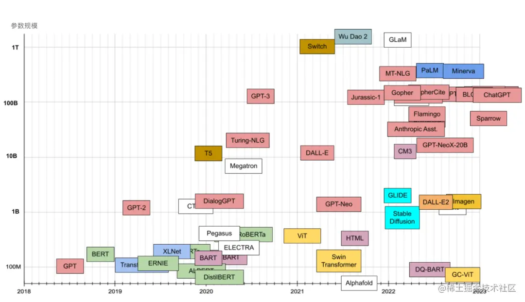 下表展示了主要大语言模型的家族谱系,不同颜色代表不同的技术起源。横轴为时间线,纵轴为模型训练的参数规模。自 2018 年以来大语言模型训练规模不断膨胀,从参数规模来看 2022 年也是暴发的一年。