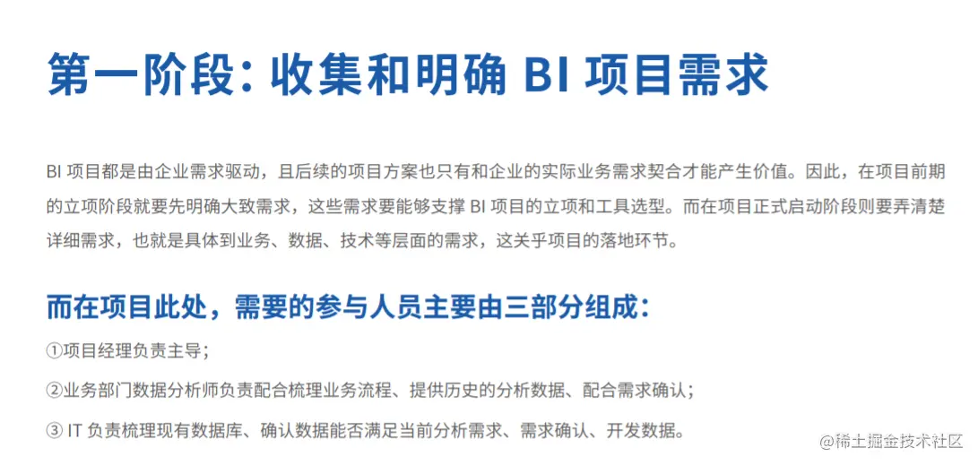 BI 项目不难,难的是让 BI 项目持续成功,即项目上线后在企业中能被持续使用,并带来实际价值。很多企业从工具选 型到项目实施,投入了大量的财力和人力,最后做出来的东西要么被荒废,要么没有持续产生令人满意的价值,这样的 项目就是失败的。