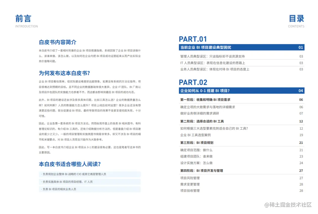 本白皮书介绍了一套相对完善的企业 BI 项目搭建指南,系统回答了企业 BI 项目该做什么、该谁来做、该怎么做,以及如何在企业内把 BI 项目成功运营起来从而产出实际业务价值等问题。