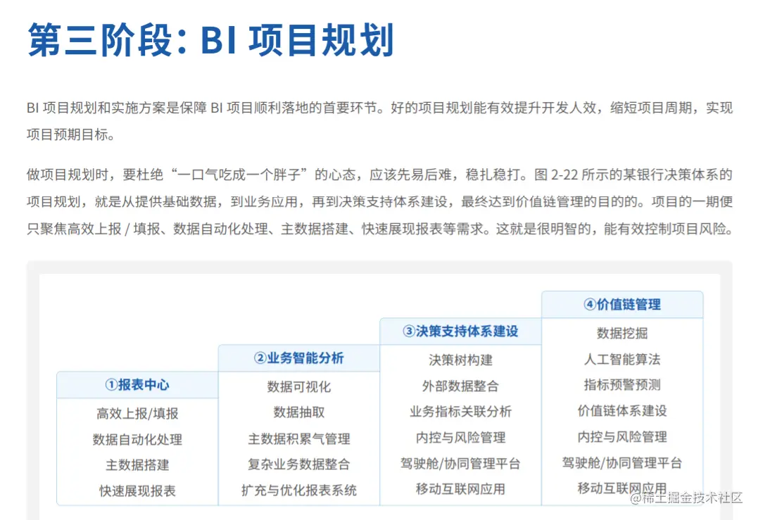 本章将围绕明确需求、工具选型、项目规划与项目管理四个阶段,详细介绍 BI 项目搭建的关键环节和建设要点,帮助 企业快速了解如何从 0-1 建设 BI 项目。