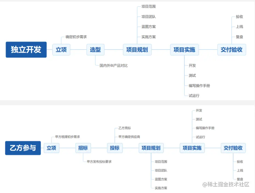 通常情况下,企业 BI 项目的建设一般分为两种情况,自身独立开发或乙方参与。尽管两种方式在某些环节存在差异,但是几个核心环节是相同的,并且在整个过程中都需要以完善的项目管理方法为指 导,遵循标准的 BI 项目规划与实施流程。