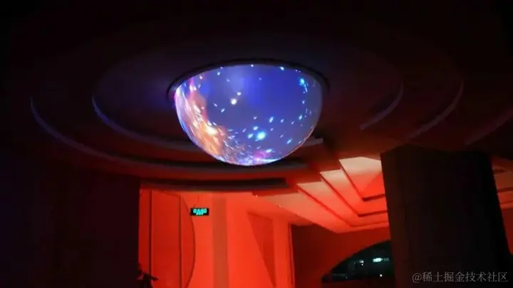这种就是我们通常所见的球幕影院,一般采用半球的形式,直径很大,从几米到几十米不等。一般会有多台投影机拼接融合实现。几米直径的略小一点的半球幕,一般用4+1的投影融合实现,即边上一圈用4台投影机投射,最顶上中间再补一台投影。融合程序采用极光坐标实现。几十米直径的即可采用常规的x,y坐标融合,也可以采用极光坐标融合实现。