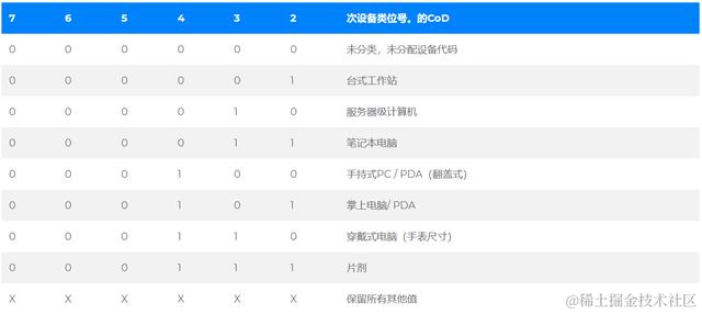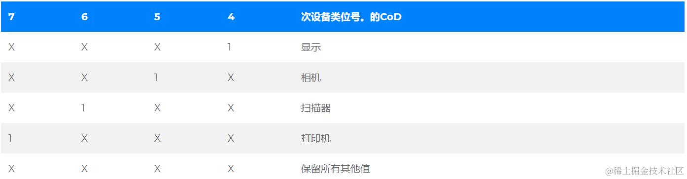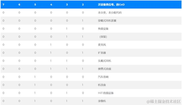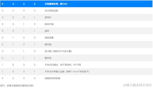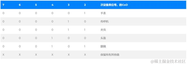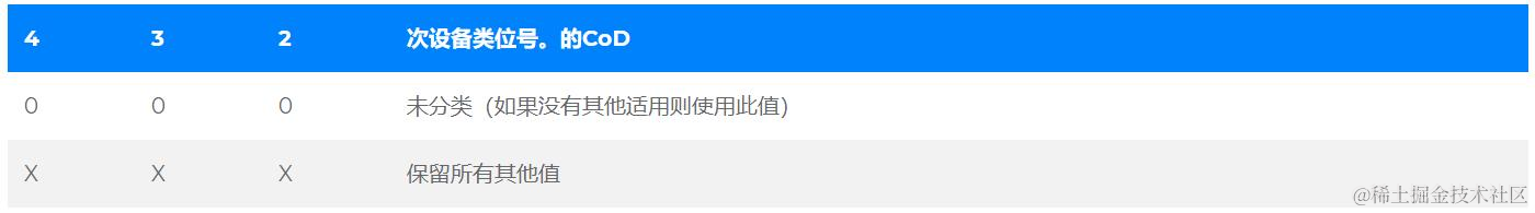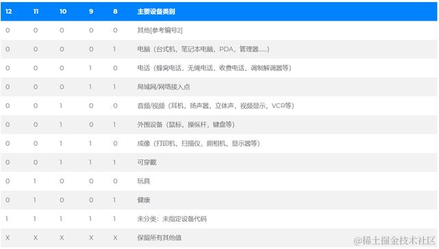 “主要设备类别”部分是定义蓝牙设备的最高粒度级别。设备的主要功能决定了其主要类别的分配。有32个主要课程。该主要类别字段的分配在表中定义。