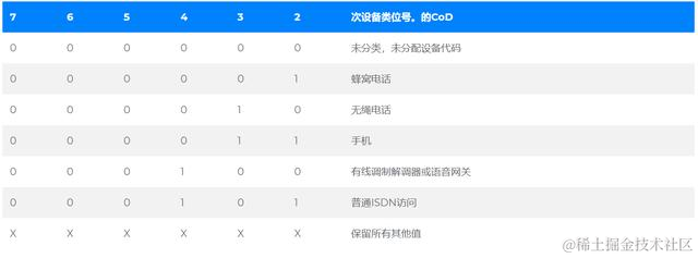 次要设备类别字段(CoD中的第7至2位)仅在主要设备类别的上下文中解释(但独立于服务类别字段)。因此,比特的含义可以改变,这取决于主要设备类别字段的值。当“次要设备类别”字段指示设备类别时,则应报告主要设备类别-例如,也可以用作无绳电话的蜂窝电话应在“次要设备类别”字段中使用“蜂窝电话”。