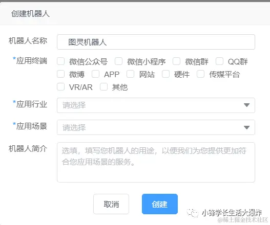 登录后申请创建机器人,填入相关信息