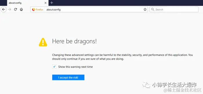 当你在Firefox的URL栏中键入about:config时,会看到一个免责声明:“Here be dragons”,它警告你,在这个区域进行调整主要是实验性的,可能会导致浏览器不稳定