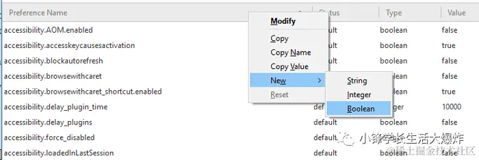 - 右击about:config页面上的任何地方,然后单击“New -> Boolean”