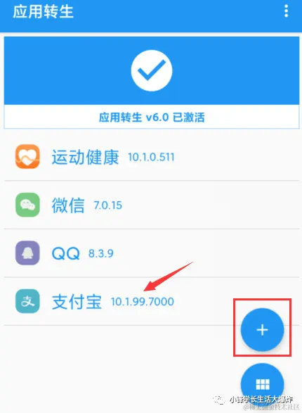 2、打开 “应用转生” ,点击右下角的 “+” 号,在应用列表里选中 “支付宝” ,把支付宝安装进来。(添加的过程中,会把你手机安装好的支付宝卸载。卸载过后,会提示你再安装。照做就行了。做完过后,就来到当前的这个界面,有个支付宝在这里)