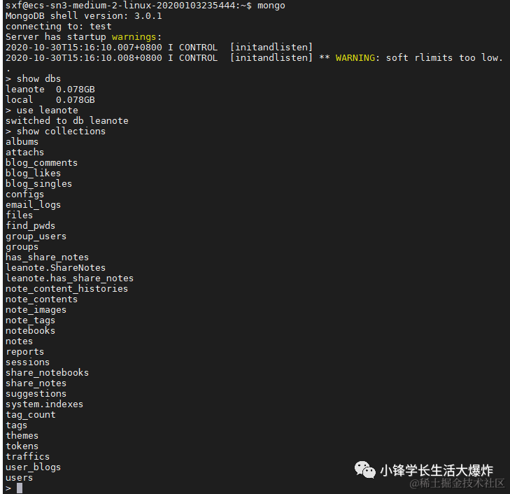 现在在mongodb中已经新建了leanote数据库, 可用命令查看下leanote有多少张"表":