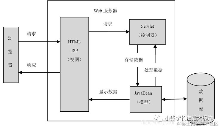 - 控制器(controller):一个或多个 Servlet 对象,根据视图提交的请求进行控制,即将请求转发给处理业务逻辑的 JavaBean,并将处理结果存放到实体模型 JavaBean 中,输出给视图显示。