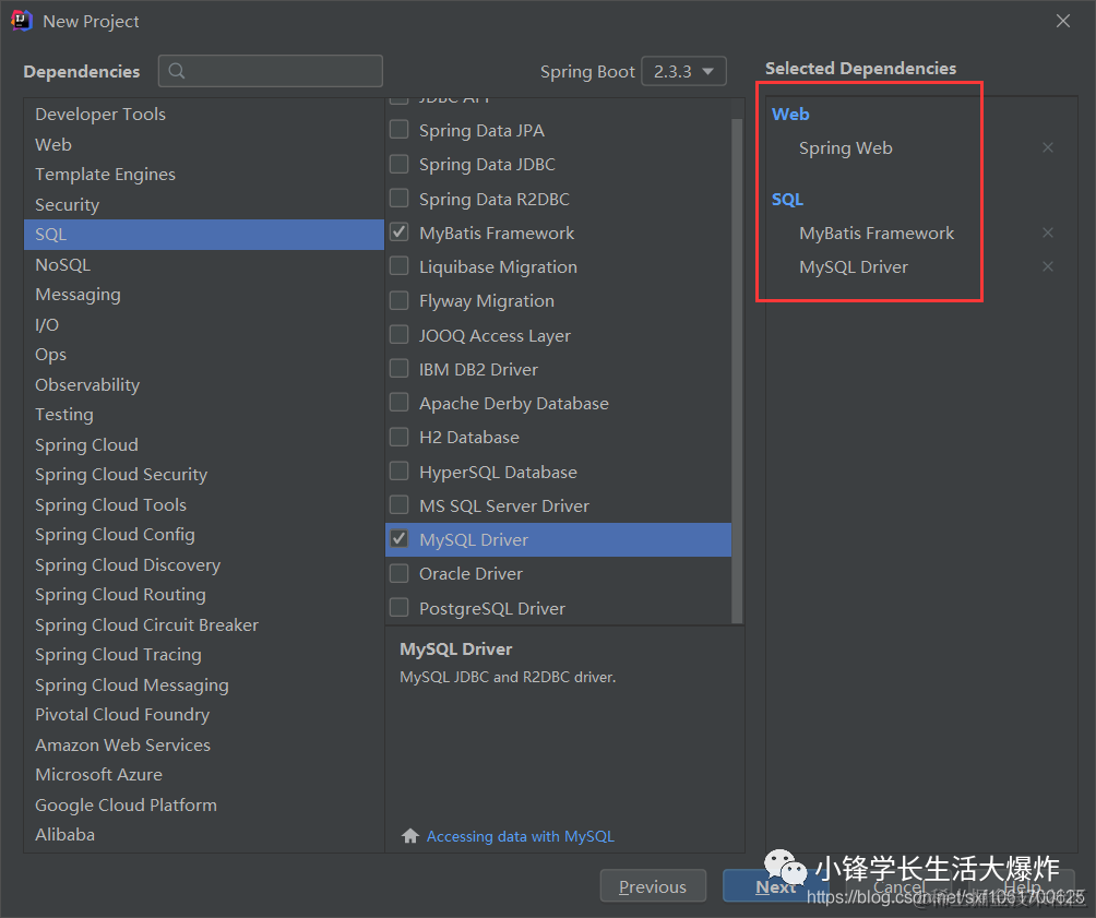 使用依赖:web(前后端交互)、mybatis(持久层)、mysql(数据库驱动)