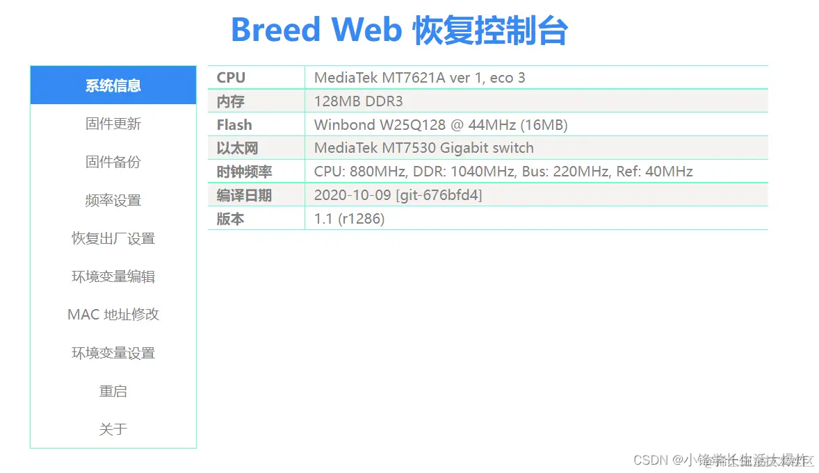 - kernel镜像:具有最少文件系统的Linux内核,包含只读文件系统,也就是说升级该镜像后,配置是不能保存的。一般在breed下先升级该镜像,作为中间固件,然后再升级sysupgrade镜像。因为大部分小米路由器在breed下不能直接升级sysupgrade镜像,需要先升级kernel镜像。