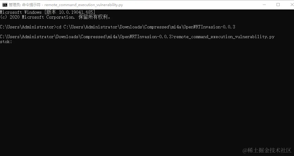 1.进入路由器界面登录获取stok值,然后打开cmd终端cd到OpenWRTInvasion-0.0.3文件夹运行remote_command_execution_vulnerability.py输入stok值【填写等号后面/前面值即可】,如果这一步报错可能是因为没有安装pip3,在终端操作下面命令: