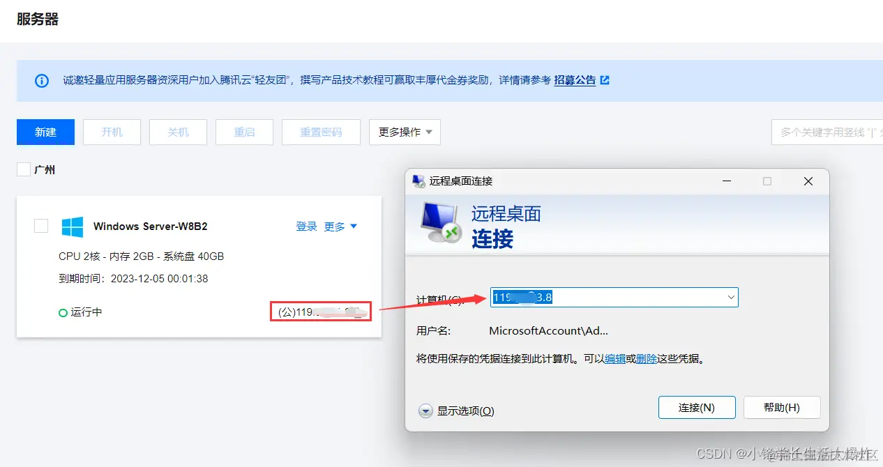 4、打开电脑上的“远程桌面连接”,输入服务器的“公网IP”。