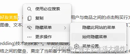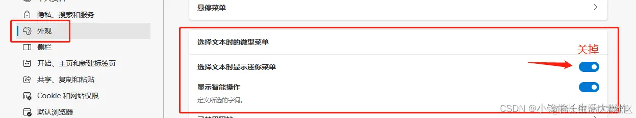 【踩坑】Edge浏览器选中文本弹出菜单导致Ctrl+C无法复制 小锋学长生活大爆炸 2023-05-22 549 阅读1分钟 目录 背景 解决 方法一 方法二 背景 Edge这个默认功能太搞心态了吧,选中文字后会自动弹出小菜单,导致按Ctrl C无法复制。还得要右键去点“复制”选项。 虽然按两次Ctrl C可能有用,但如果我还装了DeepL,那就会变成这样: 求求Edge这个 “实用” 的小功能默认关了吧,多少人会真的需要啊。。。 解决 可以关的。 方法一 1、进入设置: 2、关闭菜单: 方法二 选中一段文本,弹出小菜单,点击右边“三个点”,选择“隐藏菜单 - 始终隐藏菜单”。