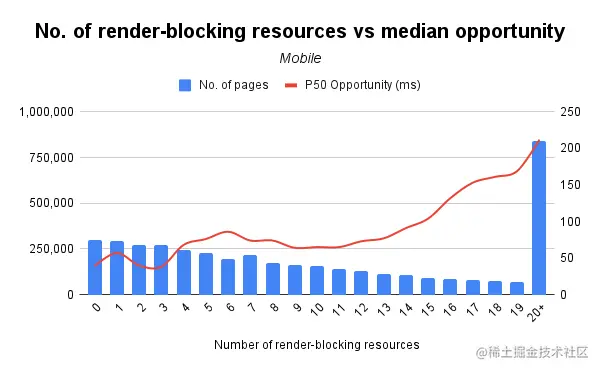 上图绘制了渲染阻塞资源的数量与opportunity(以毫秒为单位)。直观地说,您的页面拥有的渲染阻塞资源越多,下载 LCP 图像的延迟就越大。